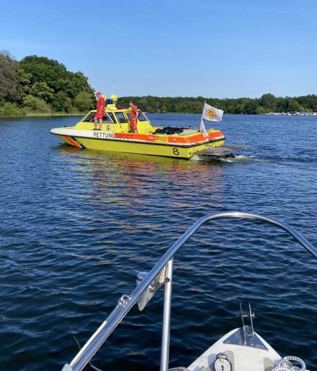 Einsatzboot von der ASB-Rettungsstation am MaienwerderwegEs war eine ruhige Nacht in einer geschützten Bucht auf dem Tegeler See. Doch am nächsten Morgen, beim Aufholen des Ankers, war auf einmal kein Wiederstand zu spüren. Die Leine mit der Kette ließ sich leicht an Bord ziehen. Aber der Anker war weg. Gut, dass er sich nicht in der Nacht gelöst hatte, sonst hätte ich mich wohl im Schilfgürtel wiedergefunden. Jetzt trieb ich ohne Halt auf dem Wasser. Der Wind nahm zu, der Motor startete wiederwillig, aber ich kam unbeschadet in den Hafen.
