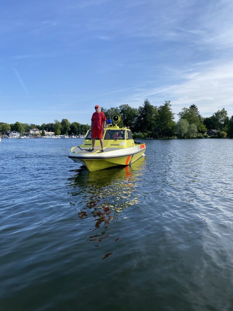 Unweit des Hafens befand sich die ASB-Rettungsstation am Maienwerderweg. Wir fanden die Handynummer vom Leiter Fabian Panther. Ich hatte Glück, er war erreichbar und erzählte, dass gleich ein Rettungstaucher-Lehrgang stattfinden sollte. Spontan wurde mein Ankerplatz zum Übungsgebiet erklärt und kurze Zeit später waren die Taucher vor Ort. Sie machten sich gelassen daran, meinen Anker zu suchen, konnten ihn aber auf dem schlickigen und mit Wasserpflanzen zugewucherten Grund nicht finden. Auch wenn die Aktion erfolglos blieb, war es ein gutes Gefühl, diese Unterstützung zu erfahren.